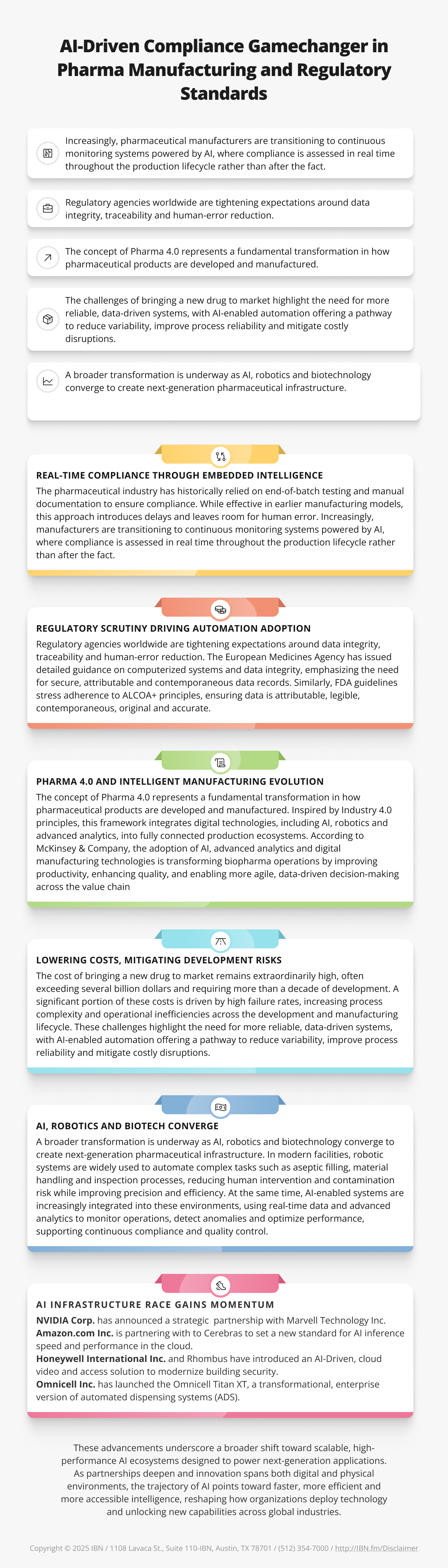 AINewsWire Editorial Coverage: As regulatory expectations intensify and manufacturing complexity grows, pharmaceutical companies are moving beyond traditional quality systems toward a new paradigm: embedding artificial intelligence (“AI”) directly into operations as a real-time compliance layer. Rather than relying on retrospective audits and manual oversight, AI-driven systems now continuously monitor, validate and optimize production processes to align with evolving Good Manufacturing Practice (“GMP”) standards. This structural shift is increasingly visible across the industry and aligns with companies such as Oncotelic Therapeutics Inc. (OTCQB: OTLC) (Profile), which operate at the intersection of life sciences and advanced digital technologies, reflecting the broader movement toward intelligent, automated compliance frameworks. With its focus on AI, Oncotelic joins other AI-focused entities, including NVIDIA Corp. (NASDAQ: NVDA), Amazon.com Inc. (NASDAQ: AMZN), Honeywell International Inc. (NASDAQ: HON) and Omnicell Inc. (NASDAQ: OMCL), that are leading out in the space.