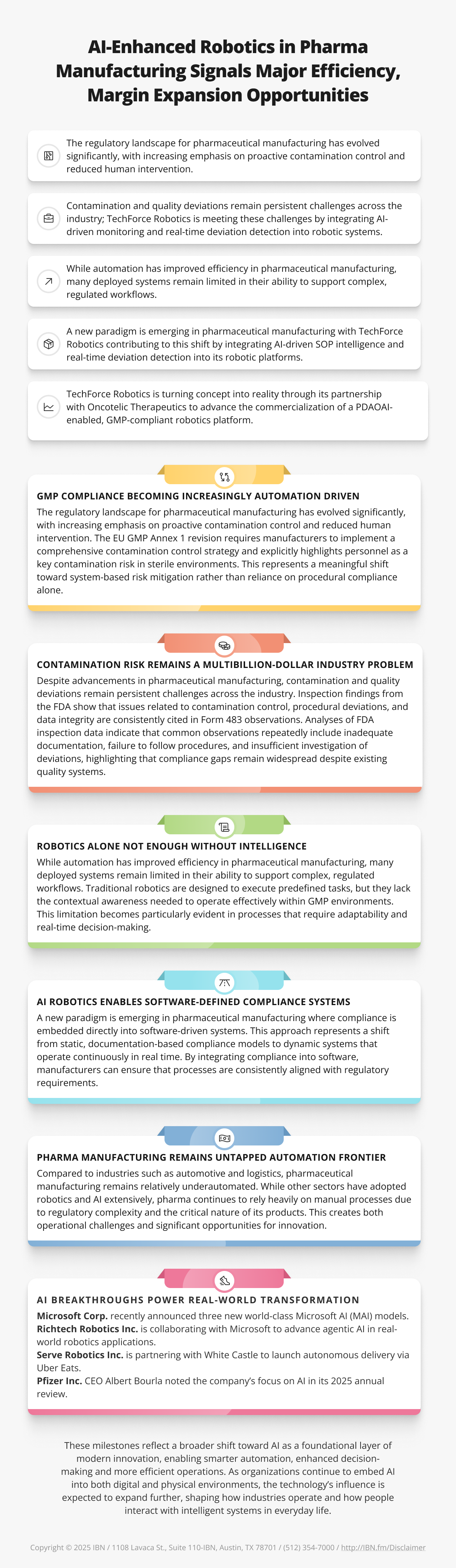 - A new paradigm is emerging in pharmaceutical manufacturing with TechForce Robotics contributing to this shift by integrating AI-driven SOP intelligence and real-time deviation detection into its robotic platforms.