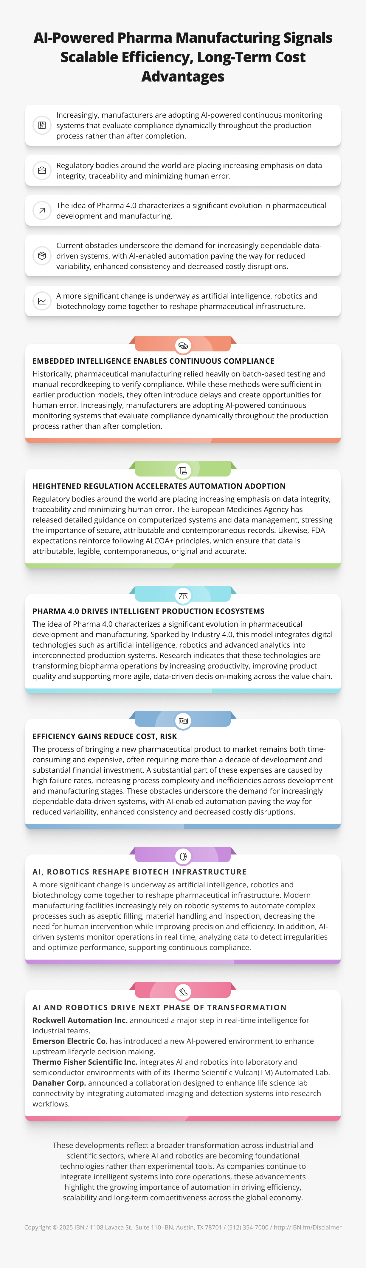 The process of bringing a new pharmaceutical product to market remains both time-consuming and expensive, often requiring more than a decade of development and substantial financial investment. A substantial part of these expenses are caused by high failure rates, increasing process complexity and inefficiencies across development and manufacturing stages. These obstacles underscore the demand for increasingly dependable data-driven systems, with AI-enabled automation paving the way for reduced variability, enhanced consistency and decreased costly disruptions.