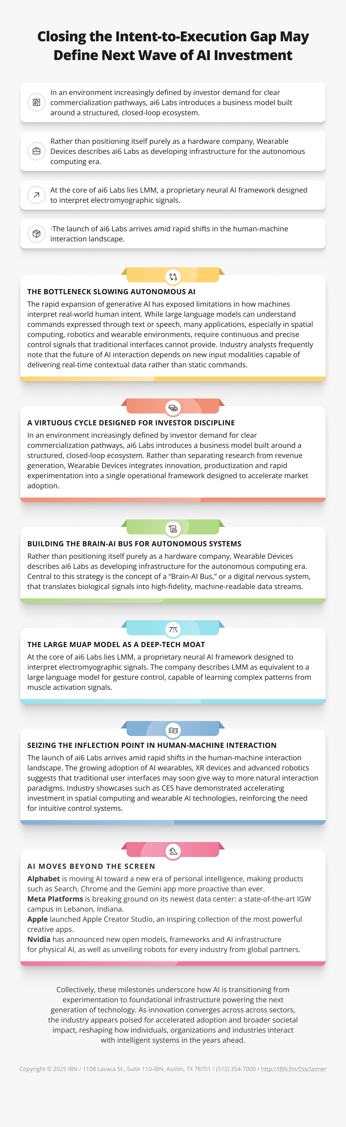 AINewsWire Editorial Coverage: As artificial intelligence (“AI”) evolves beyond generative chat systems into agentic AI capable of autonomous action, a critical bottleneck has emerged: the lack of high-fidelity, real-time input connecting human intent to machine execution. While AI models can generate text, images or strategies, translating subtle human signals into actionable machine instructions remains a major technical challenge. Without precise and continuous intent capture, autonomous systems — from humanoid robotics to extended reality (“XR”) environments — struggle to operate seamlessly alongside humans. Wearable Devices Ltd. (NASDAQ: WLDS) (Profile) aims to address this gap with the launch of ai6 Labs, a synergistic neural AI ecosystem designed to bridge intent and digital reality by integrating research, product monetization and accelerated innovation through technologies such as its Large MUAP Model (“LMM”). The launch positions the AI pioneer as a foundational infrastructure provider for the emerging autonomous AI era and establishes it as an innovator in the space, enabling boosting solutions by other AI leaders, such as Alphabet Inc. (NASDAQ: GOOG), Meta Platforms Inc. (NASDAQ: META), Apple Inc. (NASDAQ: AAPL), NVIDIA Corp. (NASDAQ: NVDA) to the next level.